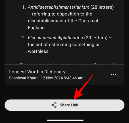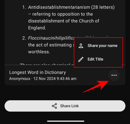 By default, your name will be removed from the chat. But if you want to add include your name, tap on the three-dot icon in the bottom right corner and select Share your name. You can also Edit title if you like. Once you’re satisfied, tap Share Link.