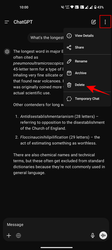 You can delete your ChatGPT chats in a couple of ways. While you’re in the middle of a conversation, tap on the three-dot icon in the top right corner and select Delete.
