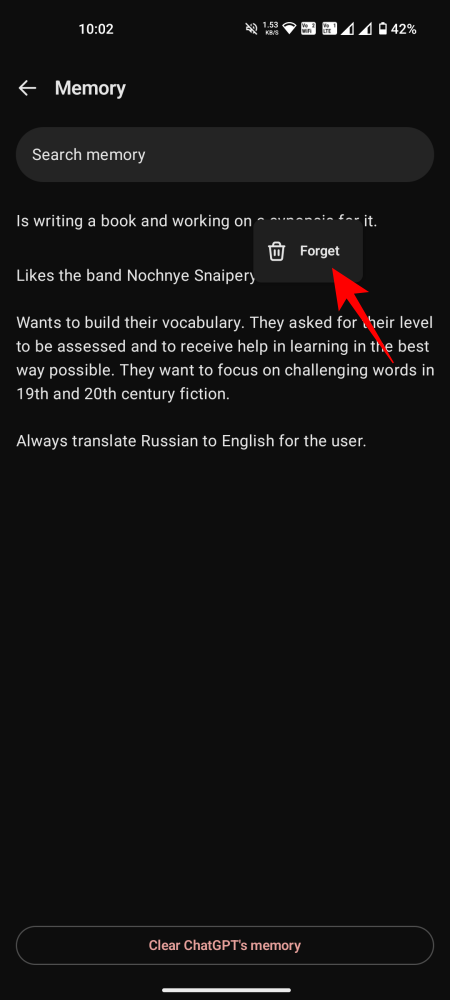 - Here you’ll see all the points that ChatGPT has memorized about you. Tap and hold on one and select Forget.