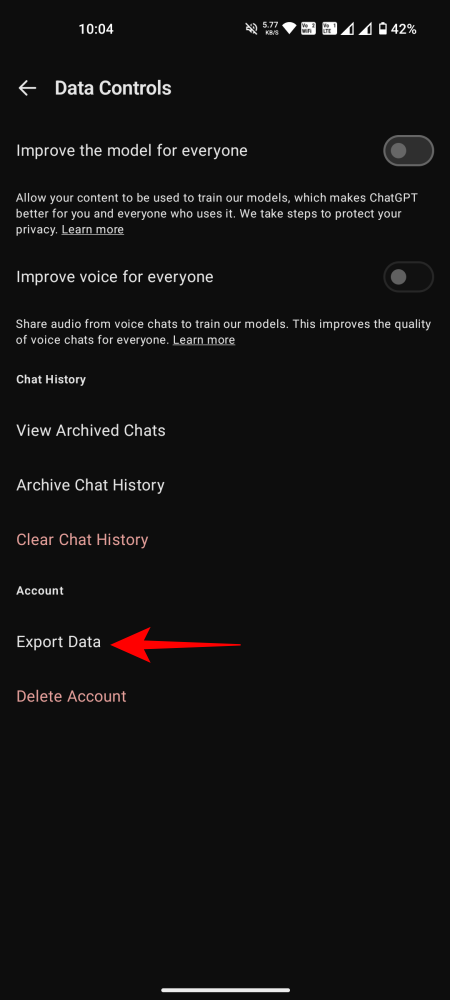 If you require access to the data, access ChatGPT’s Settings as shown before. Select Data Controls and select Export Data.