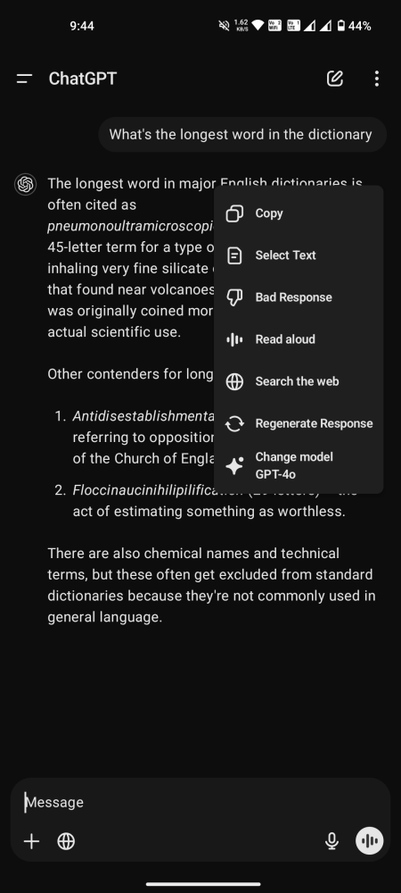 Once ChatGPT replies, you can tap and hold the reply to get addition options. Apart from the options already available in the prompt box, you can ‘Copy’ or ‘Select Text’, as well as ‘Regenerate Response’ and ‘Change model’.