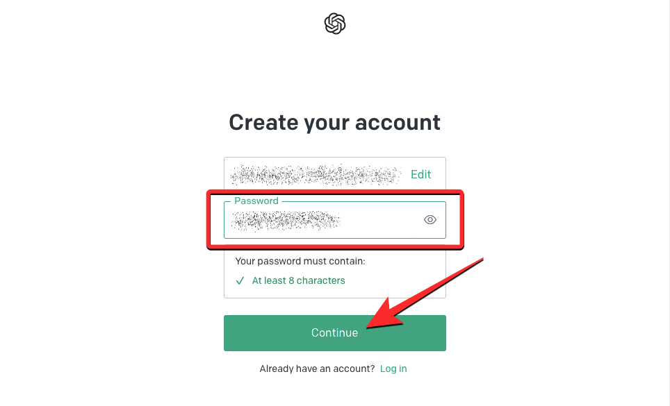 When you use an email address to sign up, you’ll be prompted to create a password on the next page. Type your desired 8-character password inside the Password box and then click on Continue.