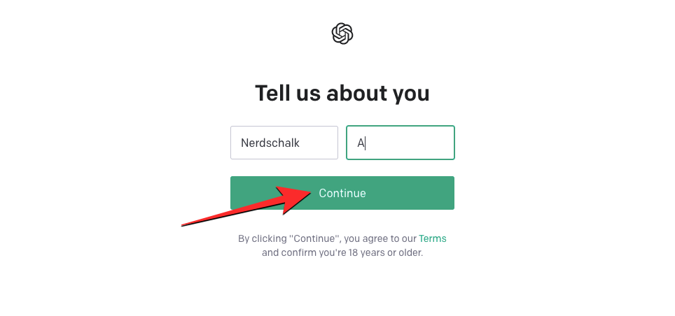 In the OpenAI page that opens, enter your first and last name in their respective boxes and click on Continue.
