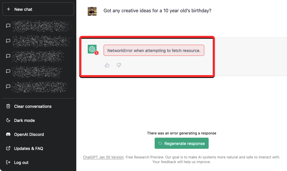 Without the internet, the chatbot won’t be able to send your queries to its servers or get you a valid response. If you type a query inside Chat after disconnecting from the internet, you will see the “NetworkError when attempting to fetch resource” message on the screen. This is true even in the case of using the ChatGPT bot on your Discord server, as the internet is required to get a valid response for your query.