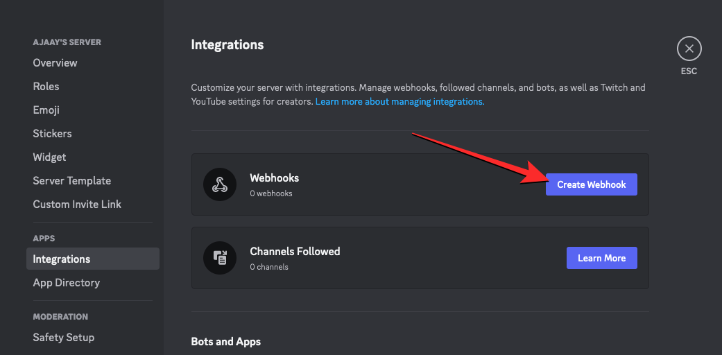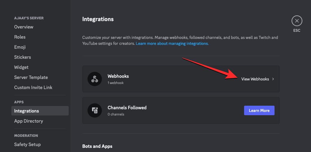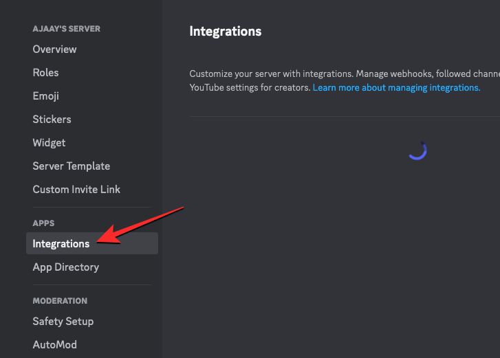 When the Server Settings show up, click on the Integrations tab under “Apps” on the left sidebar.