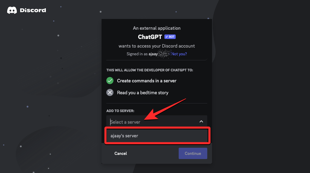 The next screen is where you allow ChatGPT Bot to access your Discord server. Here, click on the Add to Server dropdown menu and select the server inside which you want to integrate the ChatGPT bot.