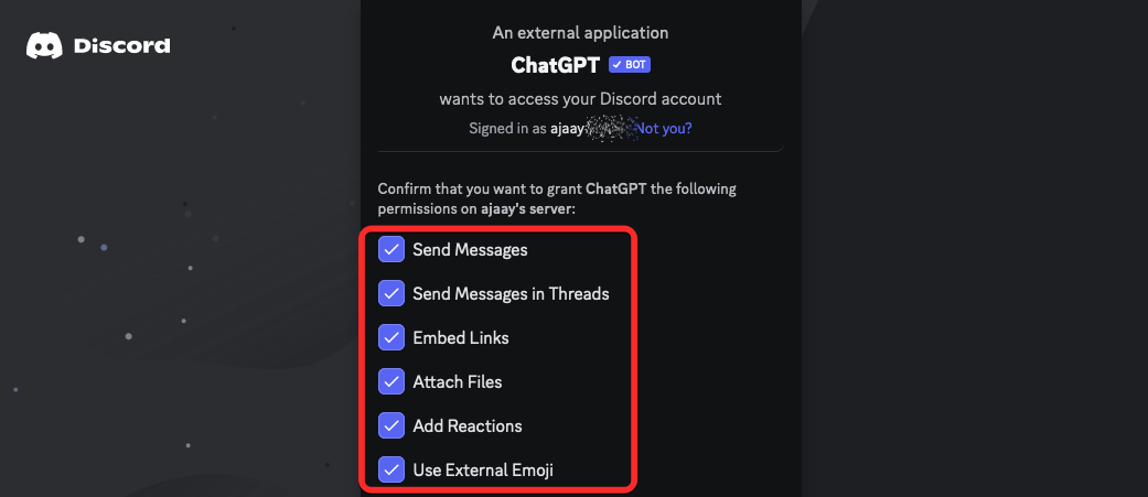 ChatGPT will now ask for access to your account along with certain permissions. Make sure you check the boxes for the permissions you’re willing to give to the ChatGPT bot.