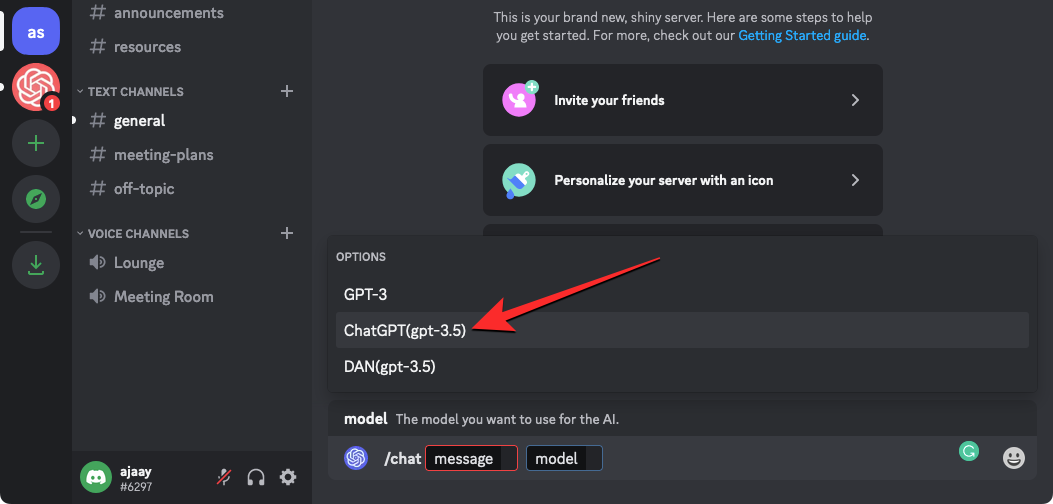 From the menu that shows up, select the GPT model you want to use to interact with. We chose ChatGPT(got-3.5) in this instance.