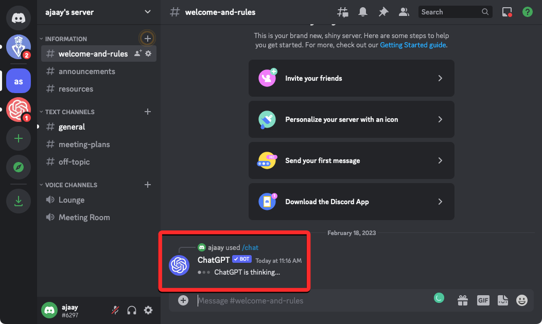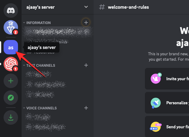 Once you’ve added the ChatGPT bot to your Discord server, open Discord.com and select your server tab from the left sidebar.