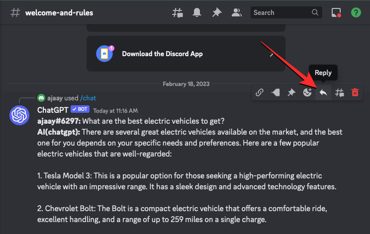 If you want to ask a follow-up question on the topic, however over ChatGPT’s reply and click on the Reply icon at the top of the message you want to reply to.