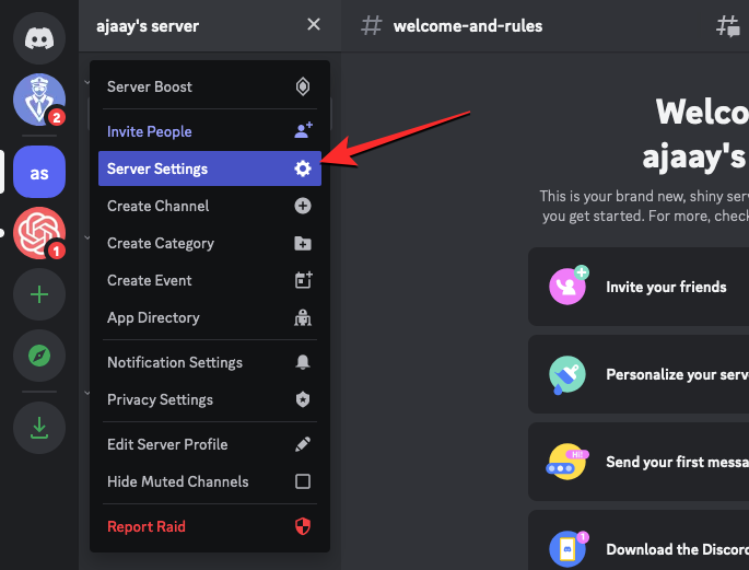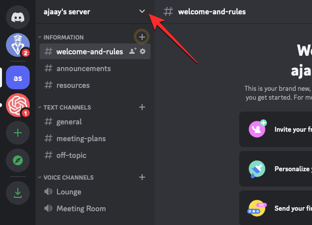 Now, click on the downward-facing arrow on the right side of the server name at the top left corner.