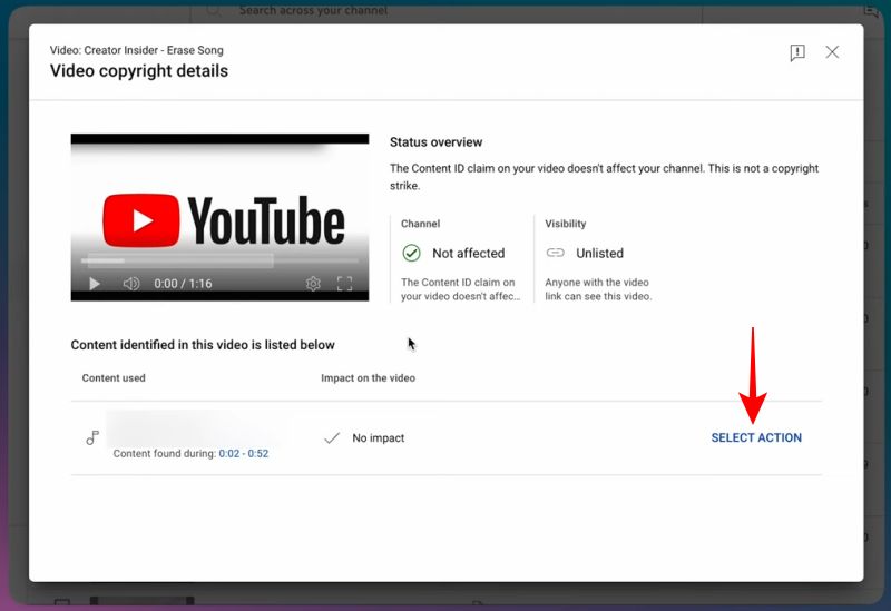 - Find the video with claimed audio in YouTube Studio, select Select Action and choose Erase Song.