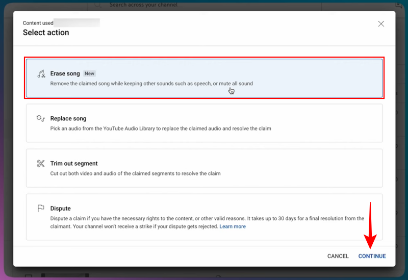 Image: CreatorInsider - Select the Erase Song option if you want to mute the claimed song but preserve other audio like dialogue and sound effects. Click Continue.