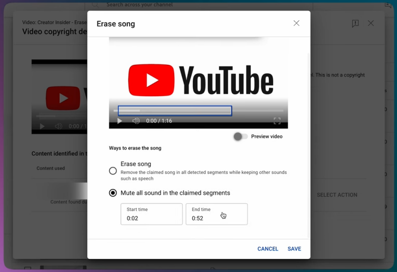 Image: CreatorInsider - In case the ‘Erase Song’ tool fails to remove the song, you’ll have to select Mute all sound in the claimed segments option and specify the time frame. Then click Save.