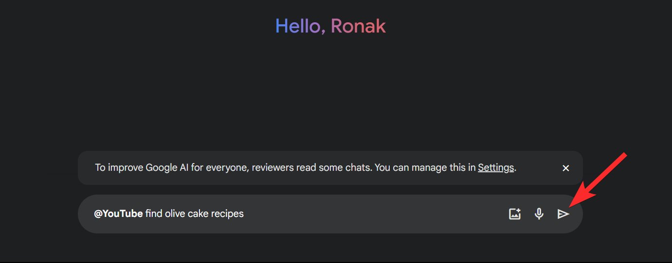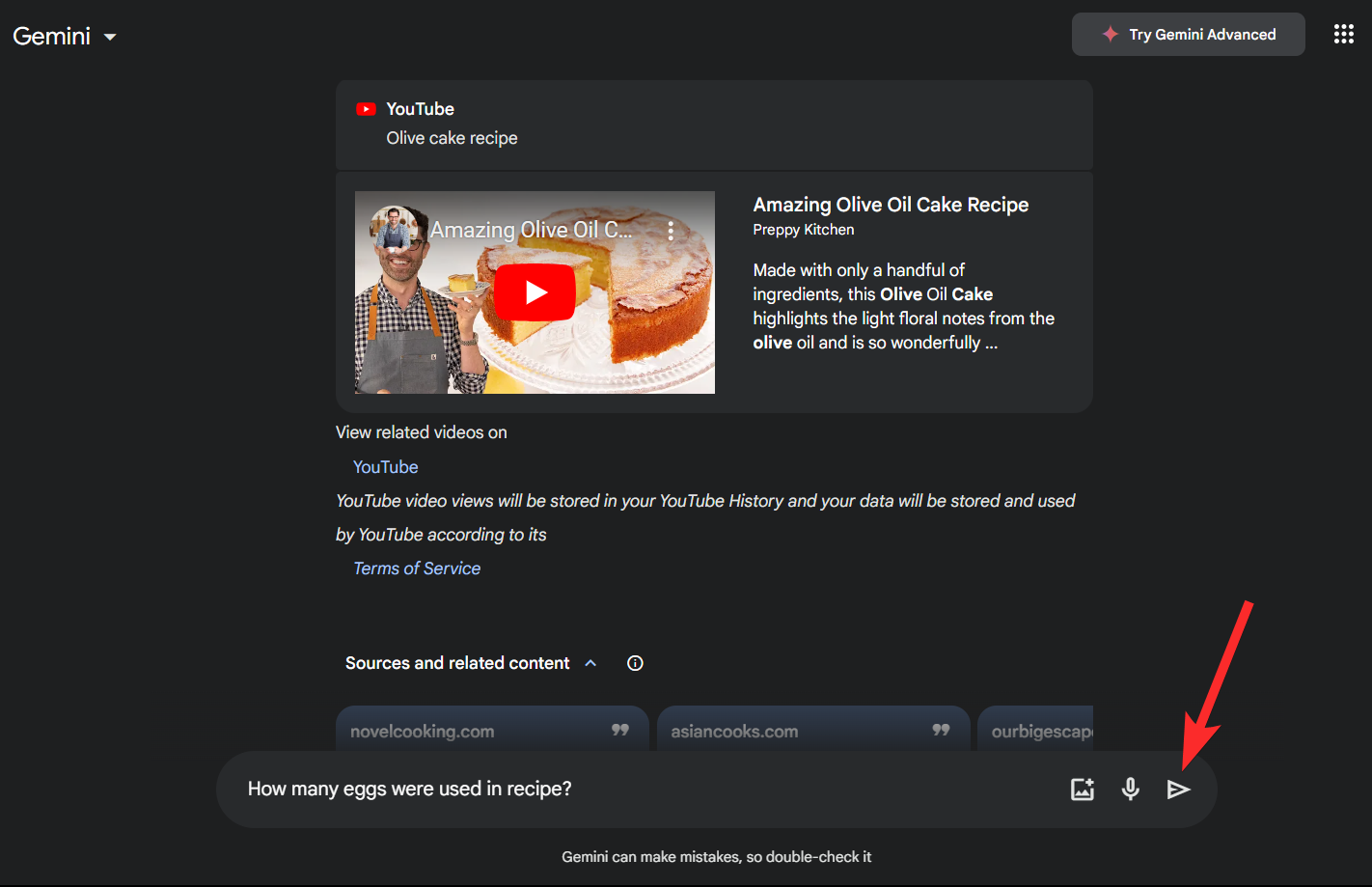 Step 1: Open Google Gemini on your browser and click on the text box at the bottom and use the syntax below to look for a relevant YouTube video that you need more information about. Let’s try an olive cake recipe for this example. So we’ll enter the following prompt: @YouTube find olive cake recipes and click the Send icon.