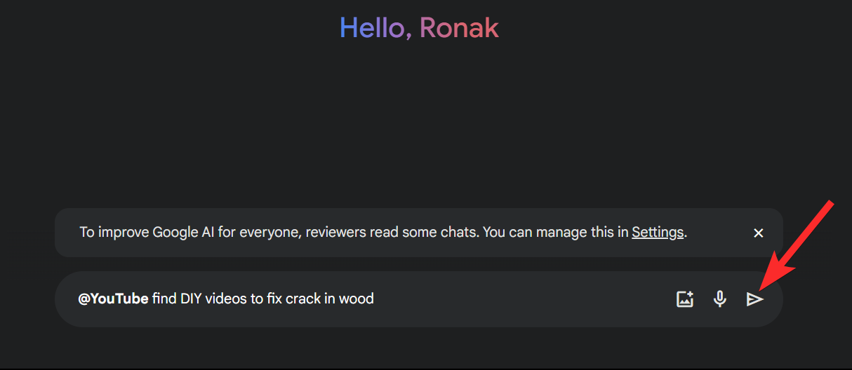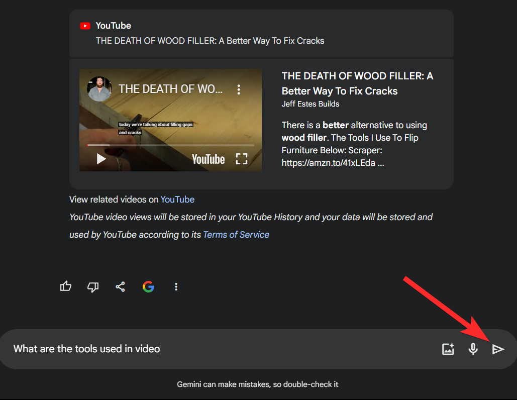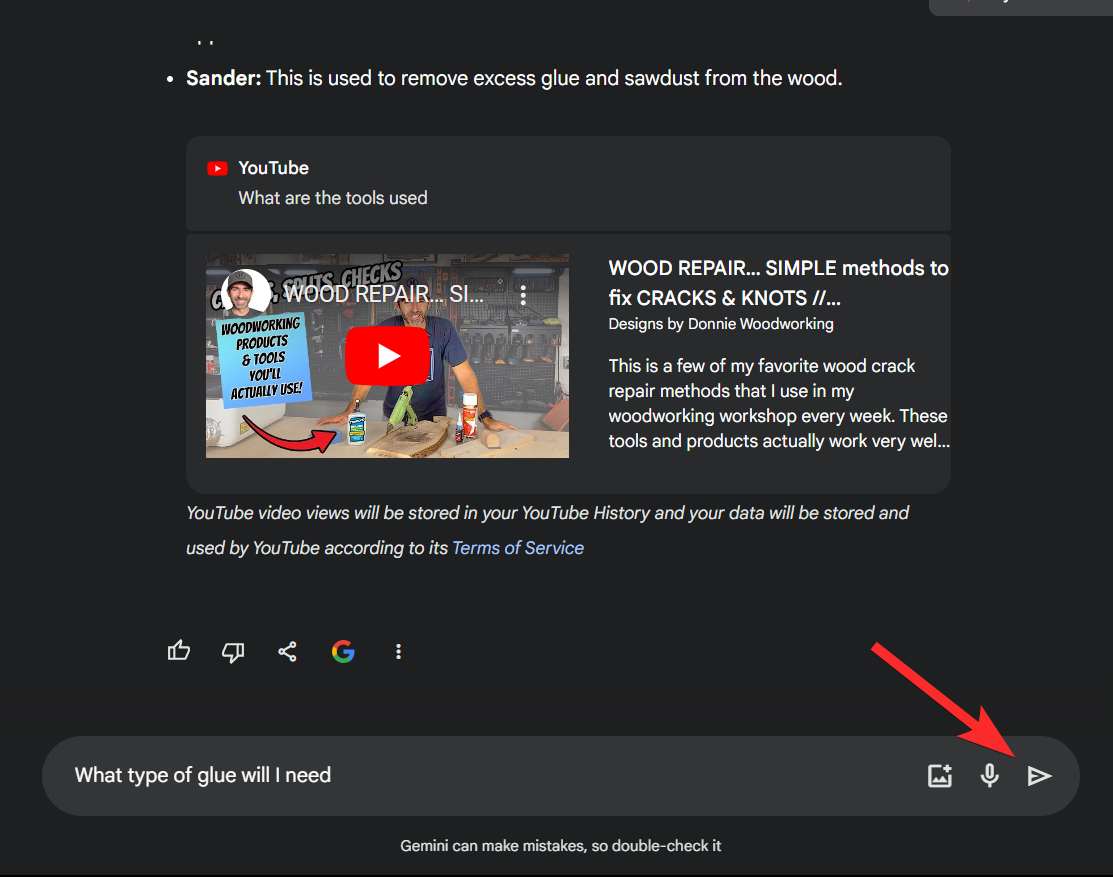 Step 9: Next, enter a prompt for your preferred DIY video in the same syntax we used above. For this example, let’s look for DIY ways to fix cracks in wood. Once entered, click the Send icon.