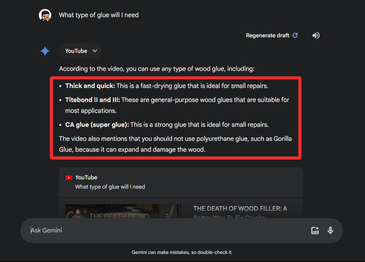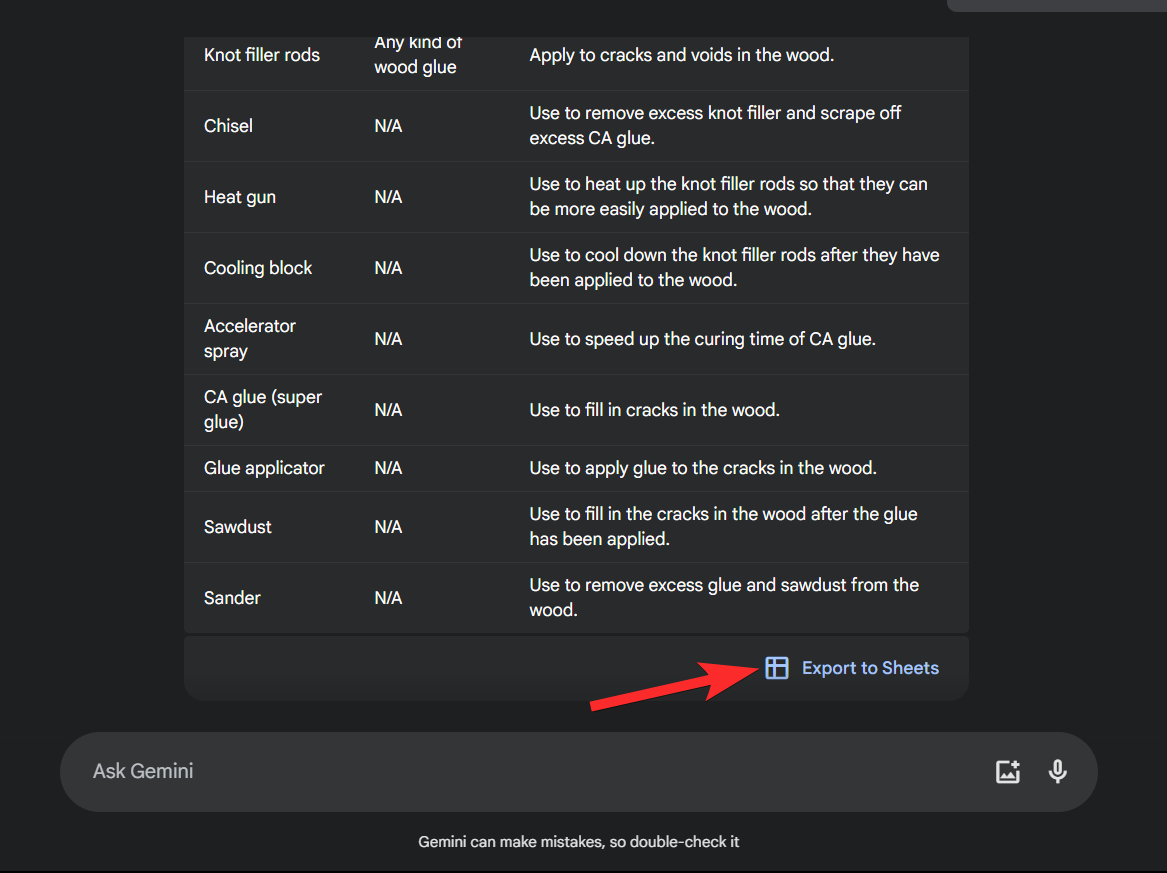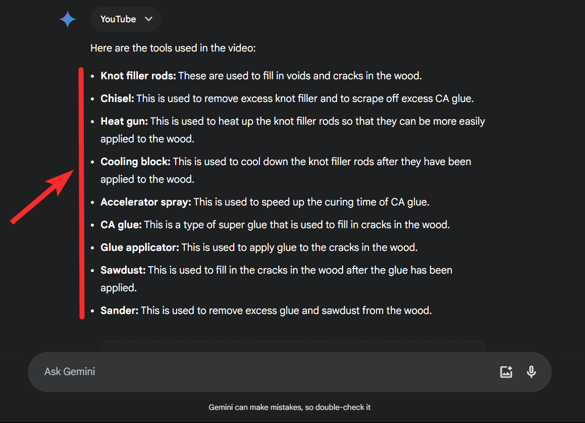 Step 11: As you can see, Gemini has listed all the tools used to fix cracks in wood in the video.