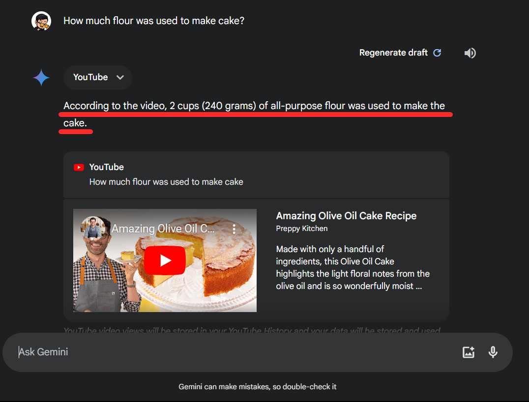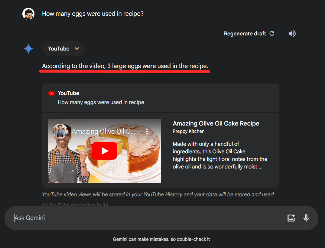 Step 2: We can now view any video we like to follow along with the recipe. But in case we forget a certain ingredient, we don’t need to go back, rewind the video and look for it. We can simply ask Gemini about them. For example, if we need to know the number of eggs used to cook the cake we can ask Gemini about it as shown below: “How many eggs were used in recipe?”.
