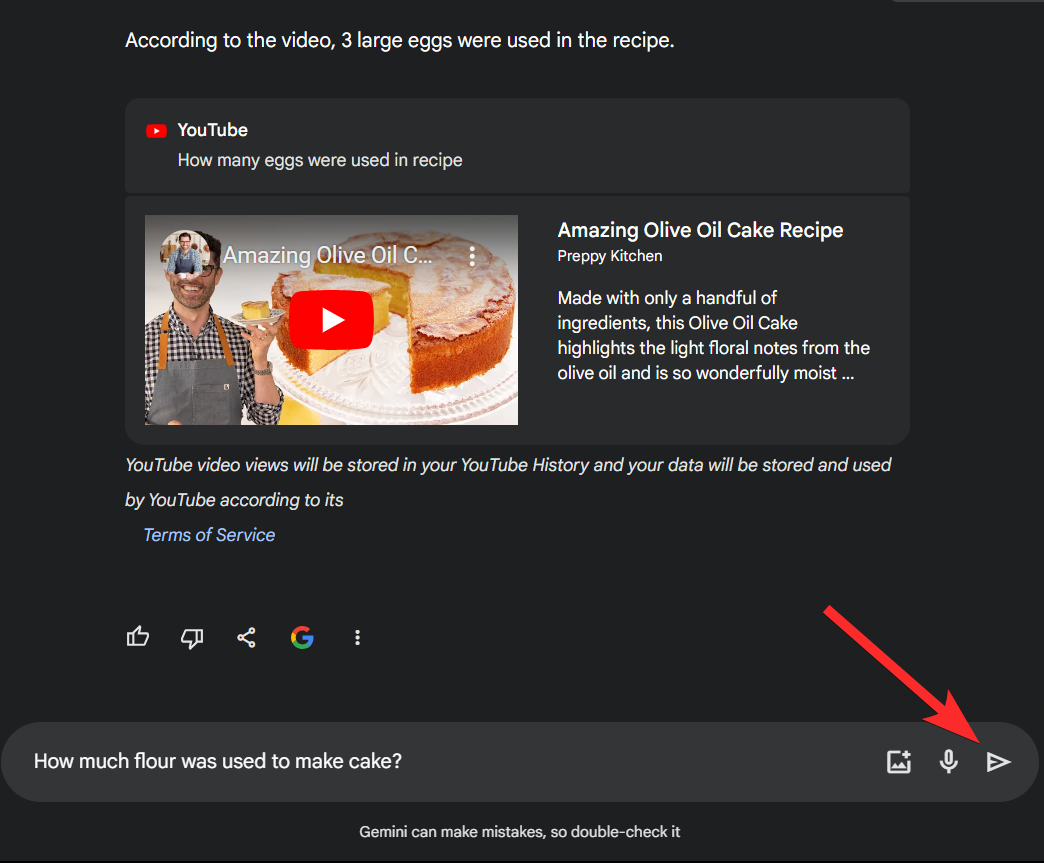 Step 4: Likewise, we can also be specific and ask Gemini about quantities. Let’s ask Gemini how much flour was used. We will simply type in our prompt and click the Send icon once done.