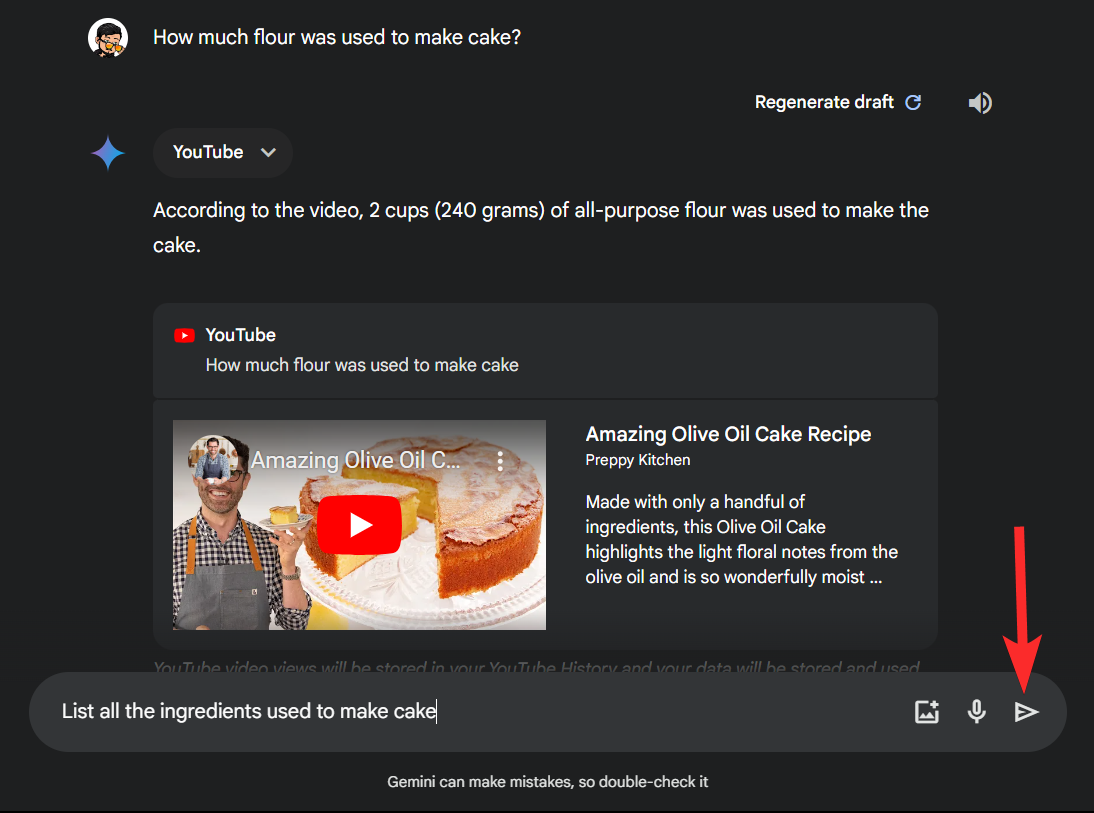 Step 6: Moreover, you can ask Gemini to list all the ingredients for you as well. This can come in handy while cooking if you ever need to glance at the recipe again without going through the entire video. As usual, we’ll type in our prompt and click the Send icon.