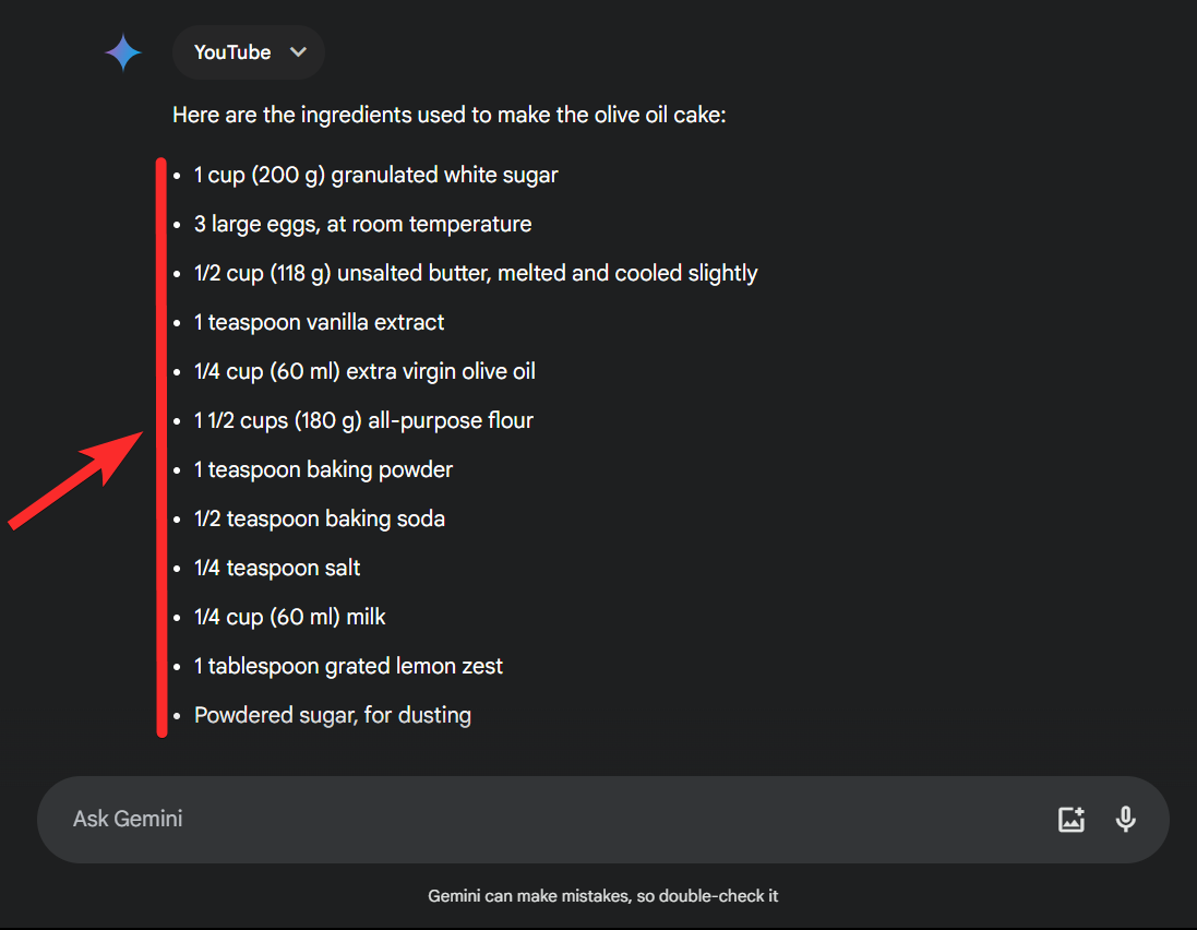 Step 7: Gemini will now list all the ingredients used in the recipe.