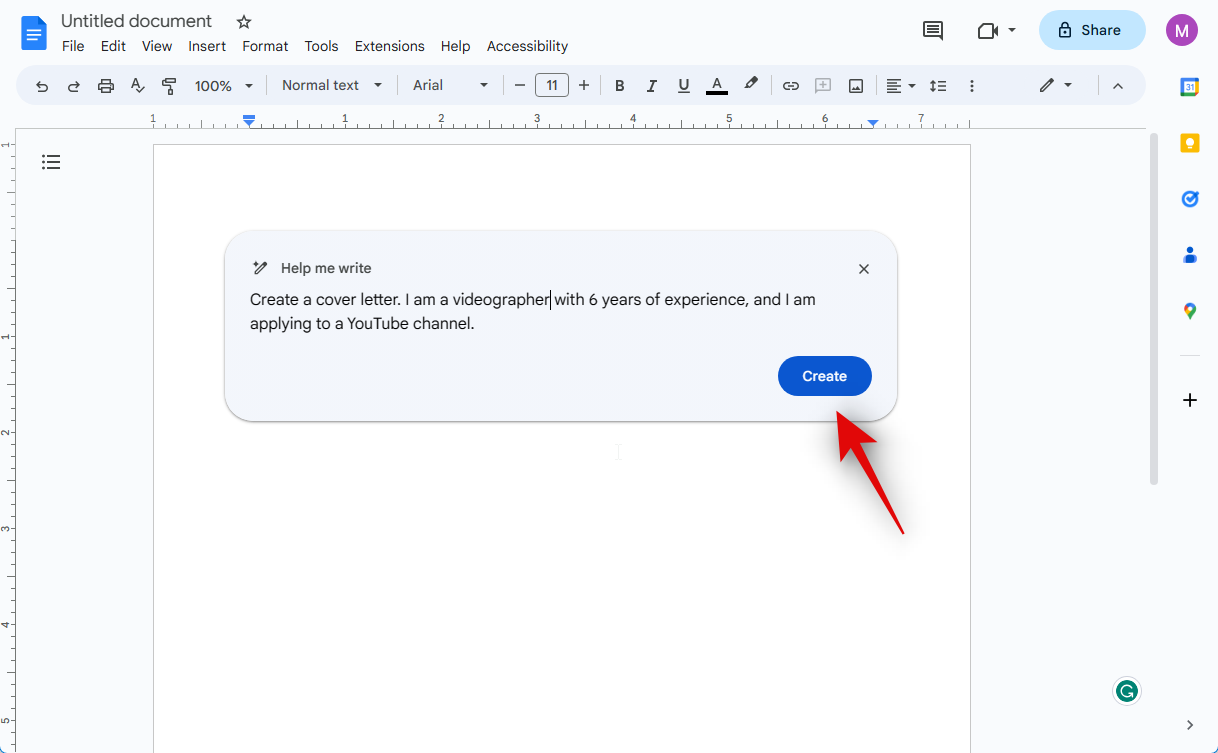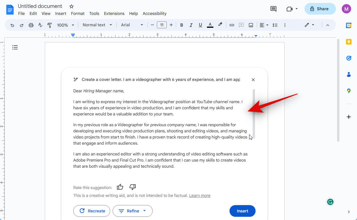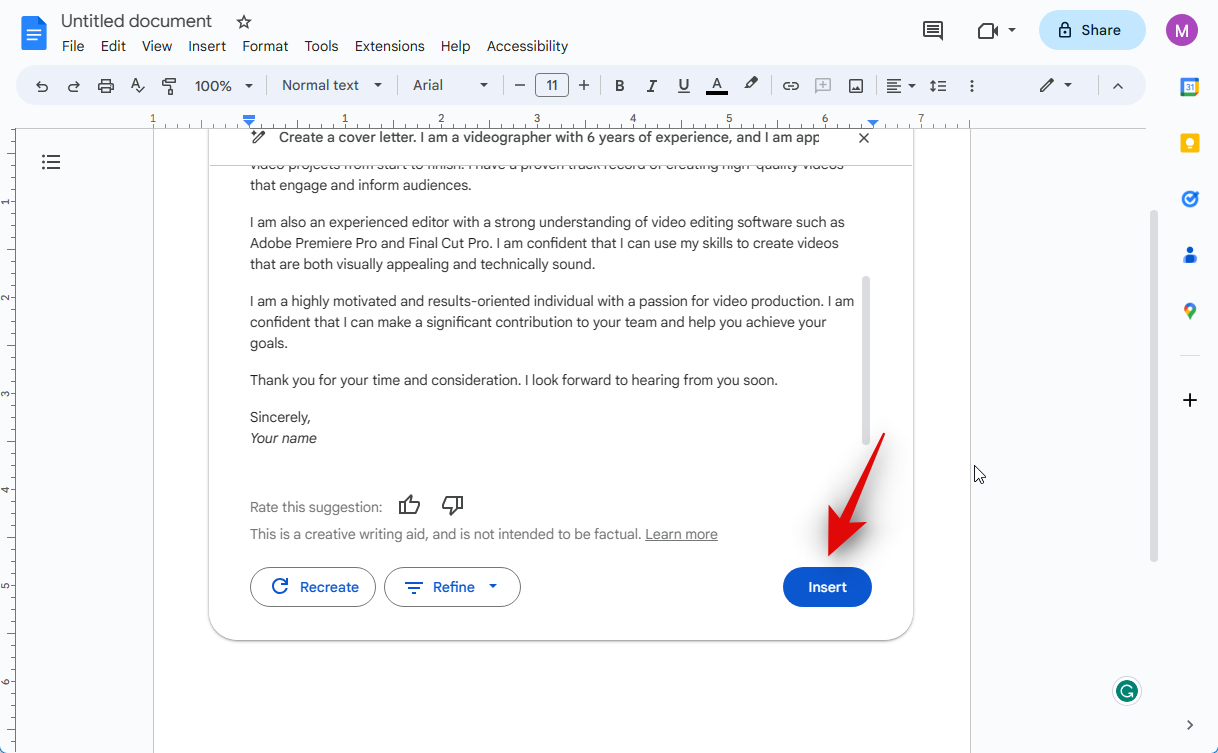 You can also prompt the AI to create your document and edit it to fit your needs. Let’s create a cover letter for this example.