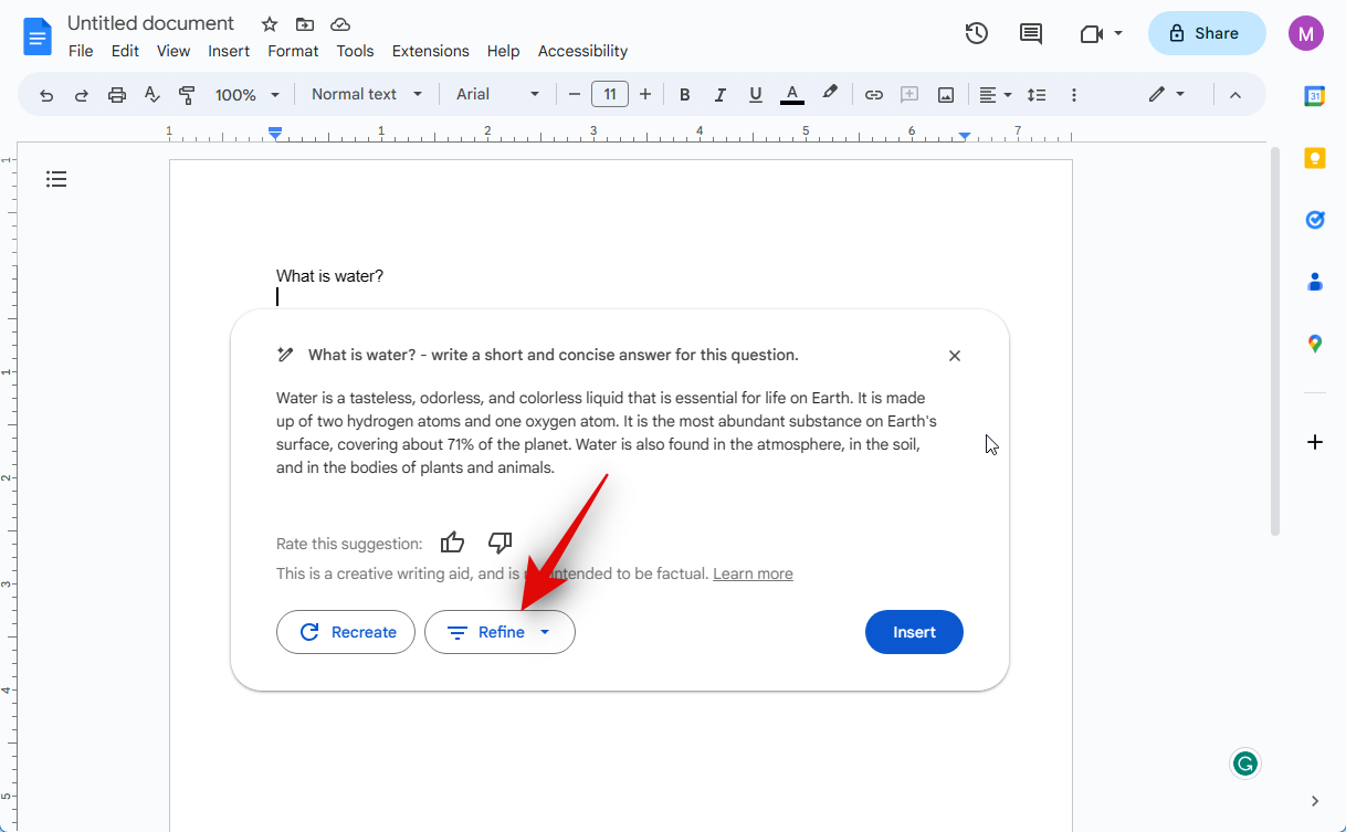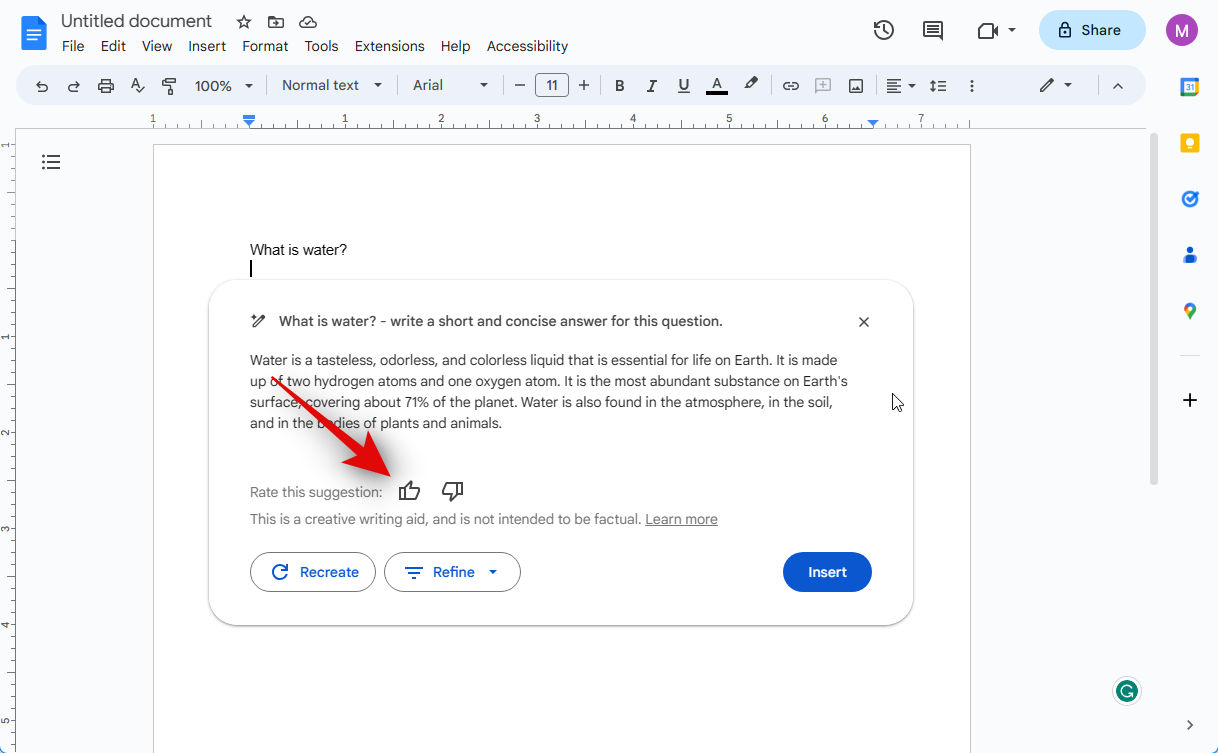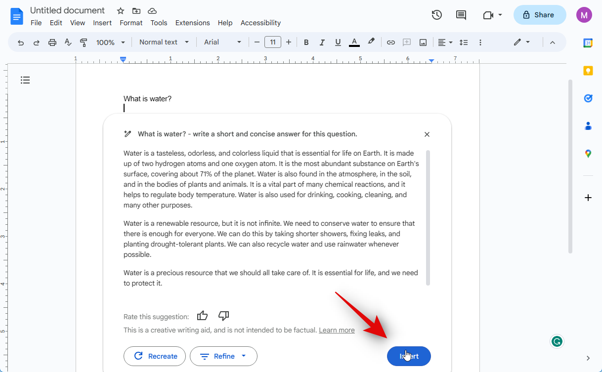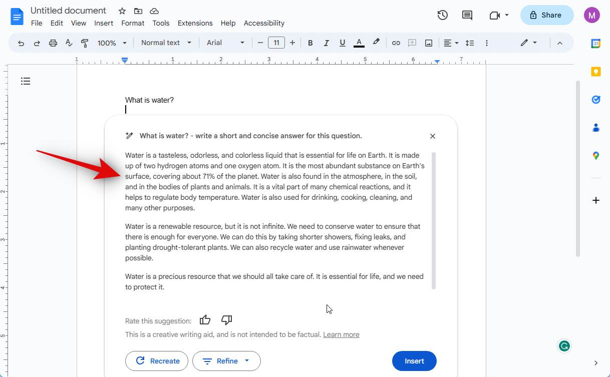 If the text is not up to the mark, you can click Recreate to regenerate a response based on your prompt.