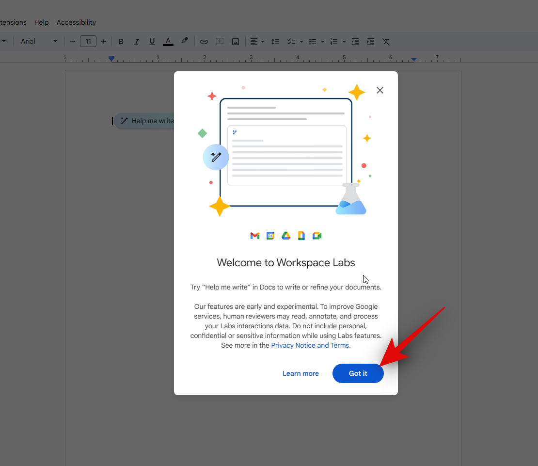 You will first need to sign up for Workspace Labs. This will allow you to become a trusted tester which will help you access and try experimental AI features across all Workspace products including Docs. Follow the steps below to help you sign up for Workspace Labs.