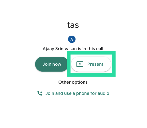 - Present: Clicking this option will let you distribute the contents of your screen to other participants. Once you select Present, you’ll have the option to choose if you want to share your entire screen, a window, or share a single Google Chrome tab.
