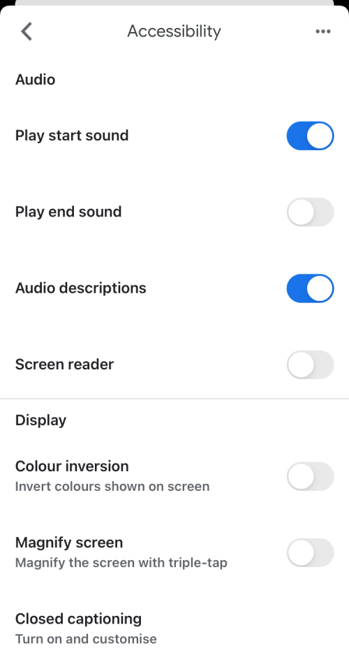 Besides audio and display, there are a few settings that you can change in terms of accessibility for your Nest Hub device. You can use these settings to enable start or end sounds for your device, audio descriptions, screen reader, color inversion, magnification, and subtitles.