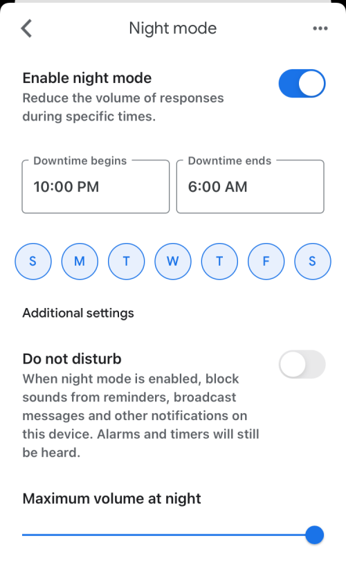 Night mode: If you want your Nest Hub to react to your requests in a lower volume than usual during bedtime, you can configure the Night mode option. When you select this option, you will be able to turn on the feature by tapping on the Enable night mode toggle. After enabling this option, you can choose the days when the Night mode is active and decide when the Downtime starts and ends. You can also configure the Night mode with Do not disturb to silence your notifications and messages during the downtime and set a maximum volume for the Nest Hub when used at night.
