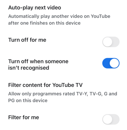Here, you can also enable/disable autoplay for yourself or unrecognized users separately and filter content that you watch on Youtube so that only TV-Y, TV-G, G, and PG videos are played on this device.