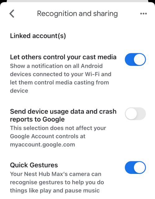 Linked accounts: When you open this option, you’ll see a list of people in your household who have permission to control your Nest Hub. On this screen, you can only view who has the access but to add or remove these linked accounts, you need to go to your Home Settings > Household. From there you can add or remove people from your household based on whom you want to use the Nest Hub and your smart home devices.