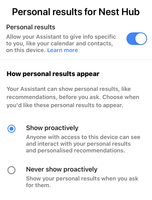 Personal results: You can choose what kind of results the Google Assistant provides with your queries based on your personal interests and usage. When you access this setting, you’ll be able to choose if the Assistant gives you personalized results proactively or not or entirely disable personal results on your Nest Hub device.