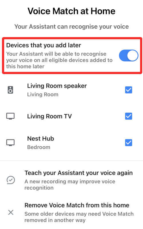 Here, you can make sure your voice match is enabled or disabled for any device you link to your account in the future, disable devices you don’t want to use Voice match with, and also retrain the Assistant to detect your voice better.