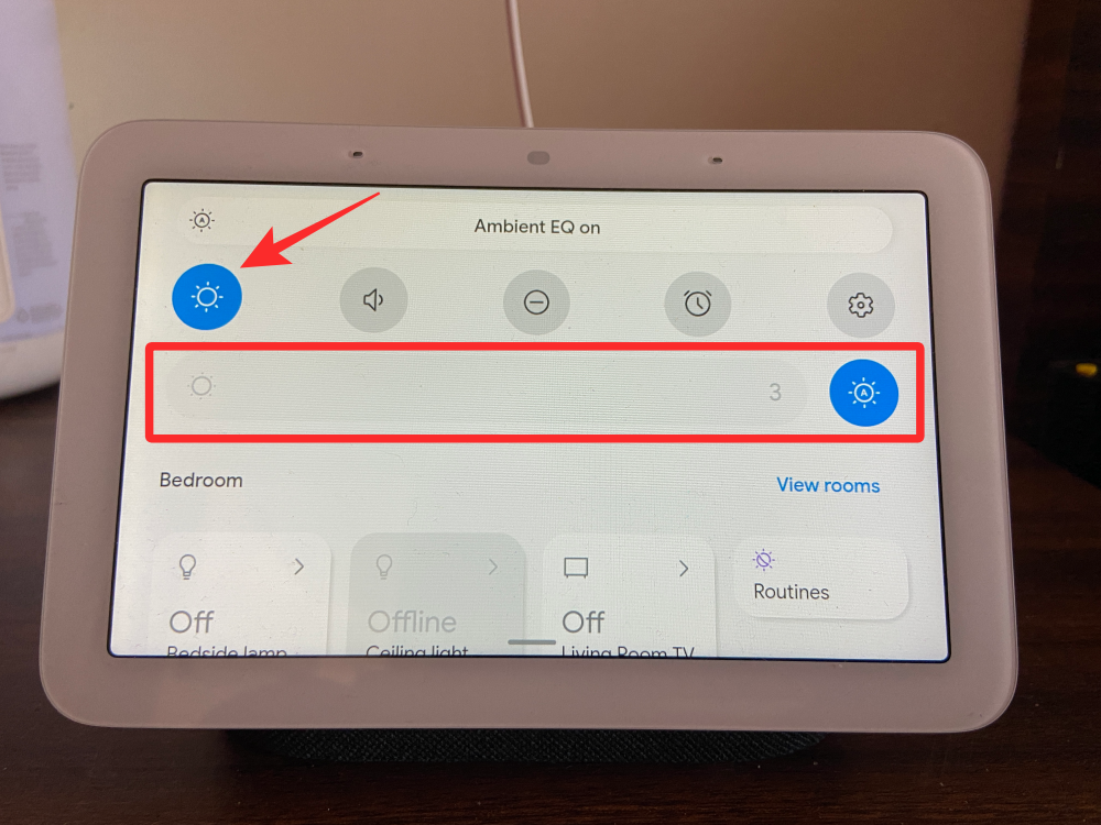 To adjust the brightness, tap on the sun icon at the top. Here you can adjust the intensity of light or turn on Ambient EQ to allow your device to adjust the brightness automatically.