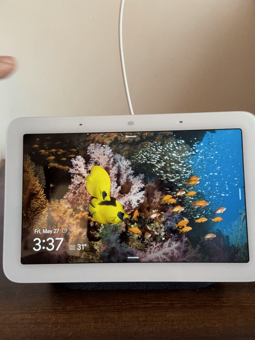The Nest Hub displays the current time and weather when it’s in idle mode but it will be limited to a smaller area of the screen to make room for the photo frame or art gallery. At any time, however, you can switch to a full-screen clock by swiping right from the left edge of your Nest Hub display.