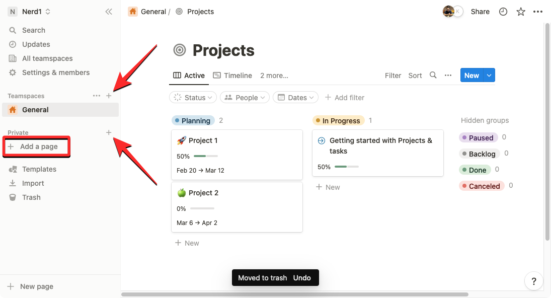 To get started, click on the + icon from the left sidebar inside either of these tabs – Teamspaces or Private. If you don’t have an existing private page on your Notion account, click on Add a page under the Private tab on the left sidebar.