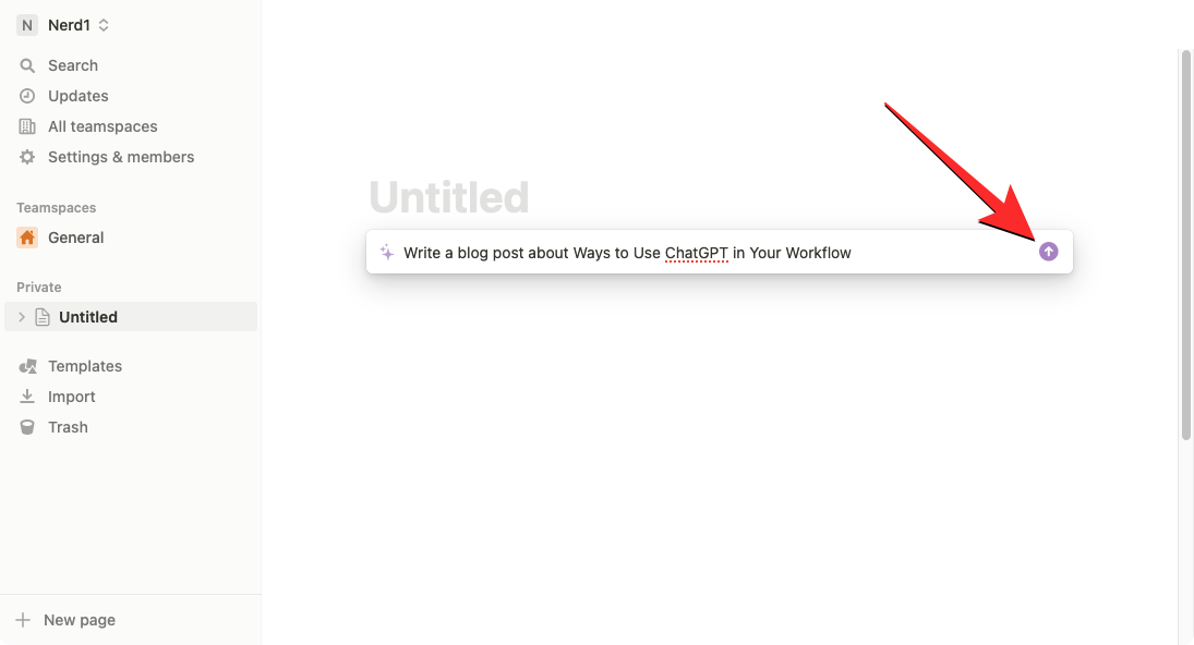 To create a new page for getting ideas with Notion AI, click on the + icon from the left sidebar inside either one of these tabs – Teamspaces or Private.
