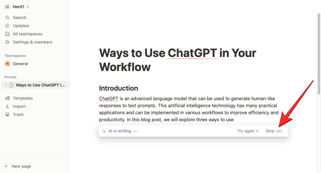 Notion AI will now start drafting the content you requested on this page. At any point during the output generation, you can click on Stop to halt the output.