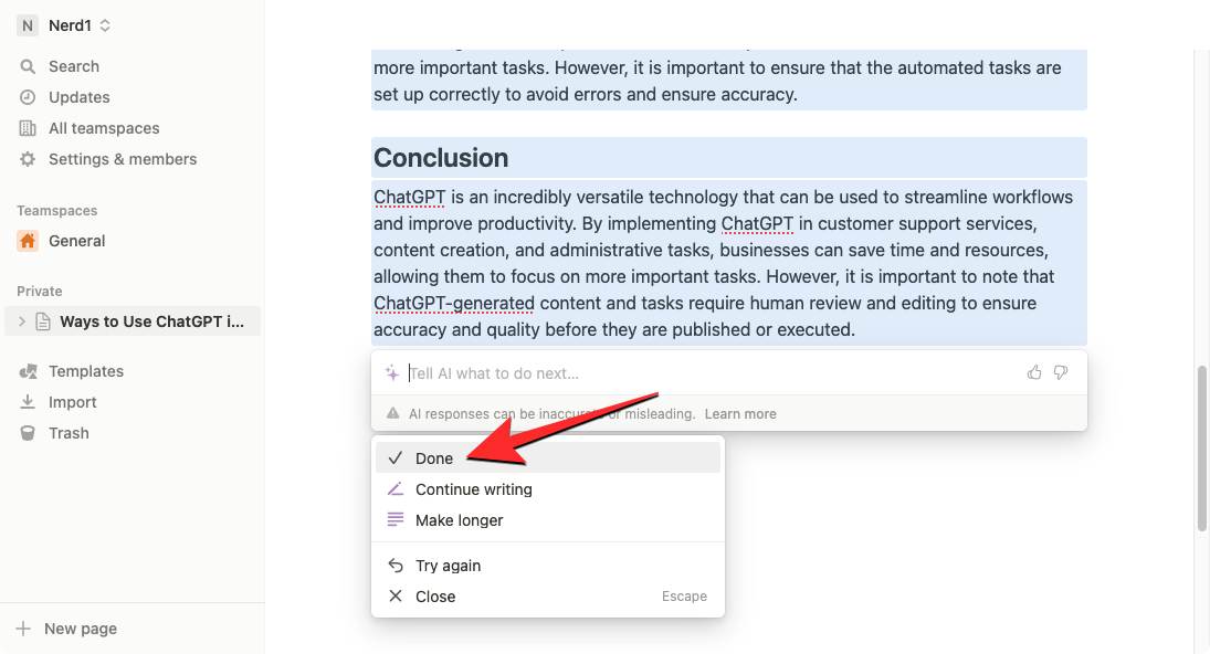 Notion AI will now start generating suggestions and ideas on the topic you provided in bulleted points. If you’re satisfied with the result, you can click on Done from the menu that appears below the generated output. If you wish to change this output or elongate it, select Try again or Make longer respectively.