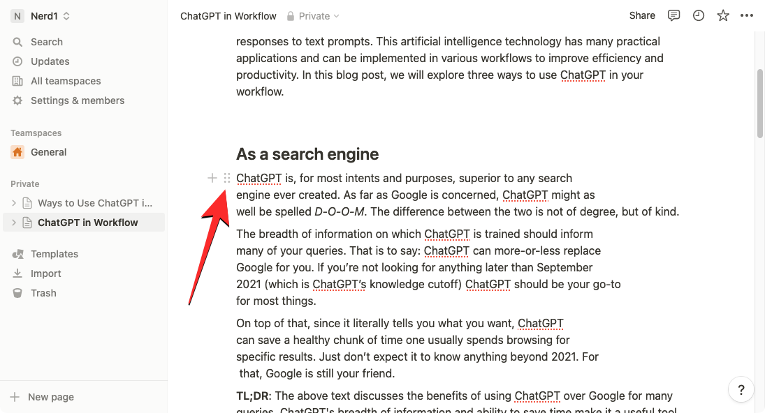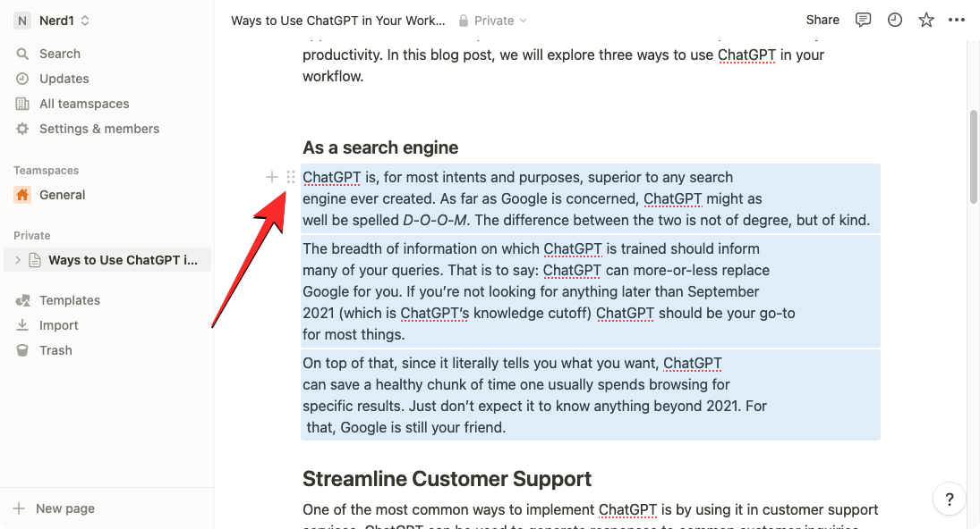 In addition to creating content and summaries from existing text, you can ask Notion AI to help you fix grammar, punctuation, and spelling errors from selected sections in your page using the built-in spell check and grammar correction tool. For this, open the page you’re working on inside Notion and use the cursor to select a desired text you wish to check for grammatical or spelling errors.