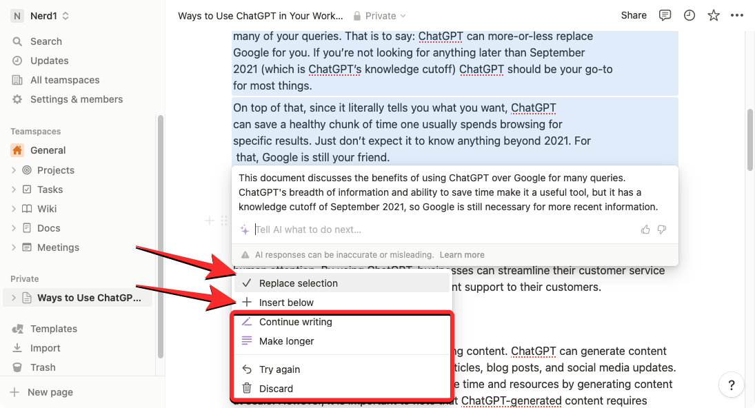 • Improve writing – Notion AI will edit the selected content and replace it with alternate text.
