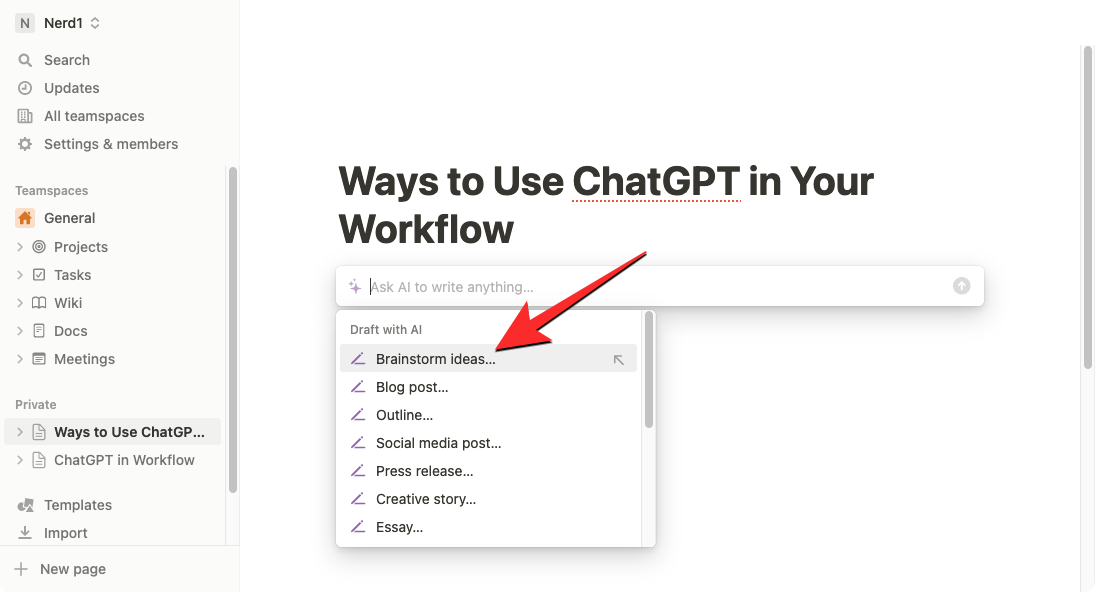 You can still use this tool from an existing page by pressing the Space key on your keyboard and selecting Brainstorm ideas under the “Draft with AI” section.