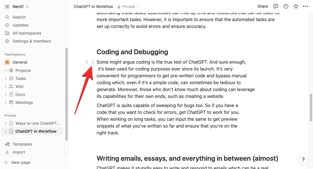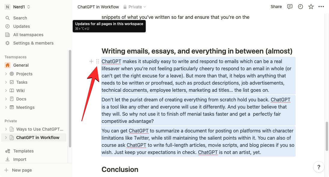 To improve written content with Notion AI, open the page you’re working on inside Notion. When the page opens, scroll to the section you want to modify and hover over it. You can select multiple sections inside a page using the cursor to modify its content.