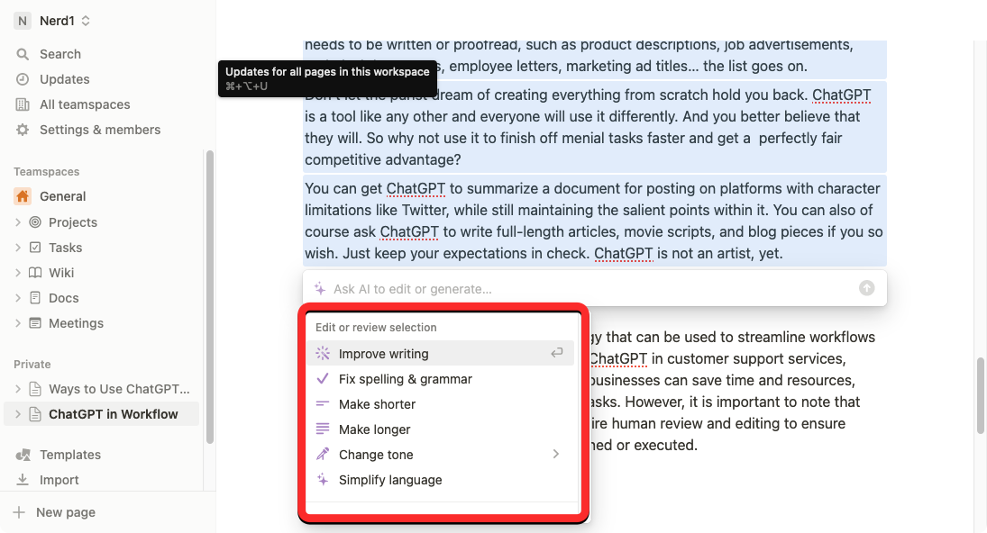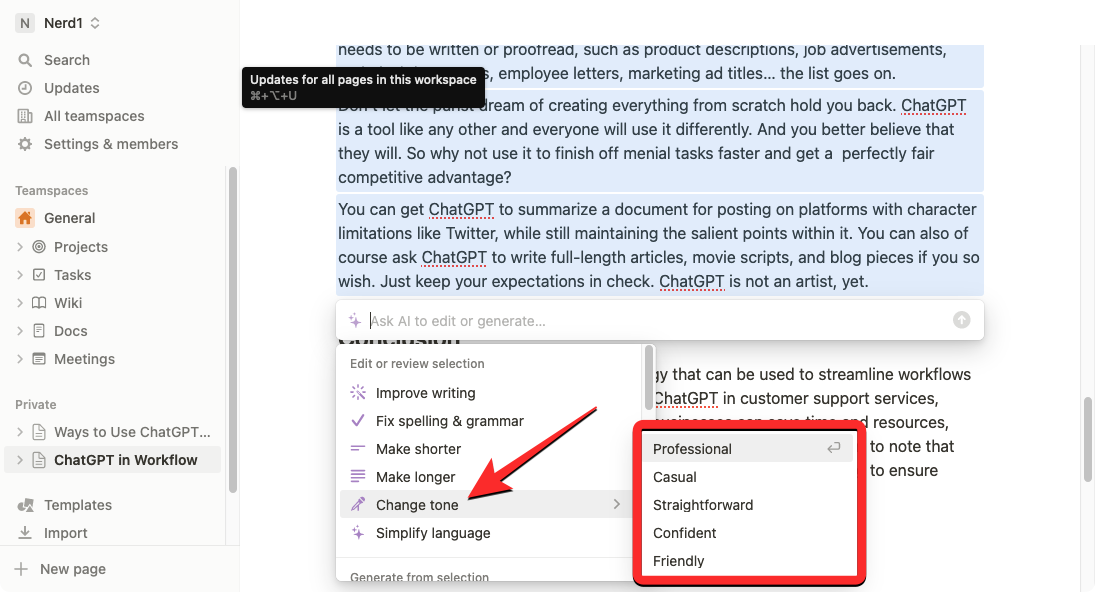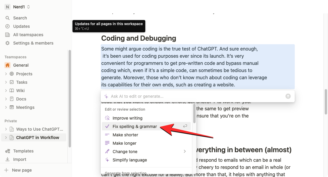 4. How to proofread using Notion AI to fix grammar, punctuation, and spelling errors