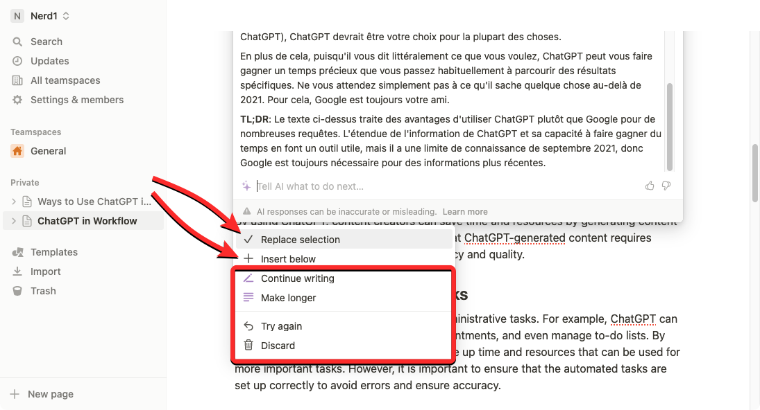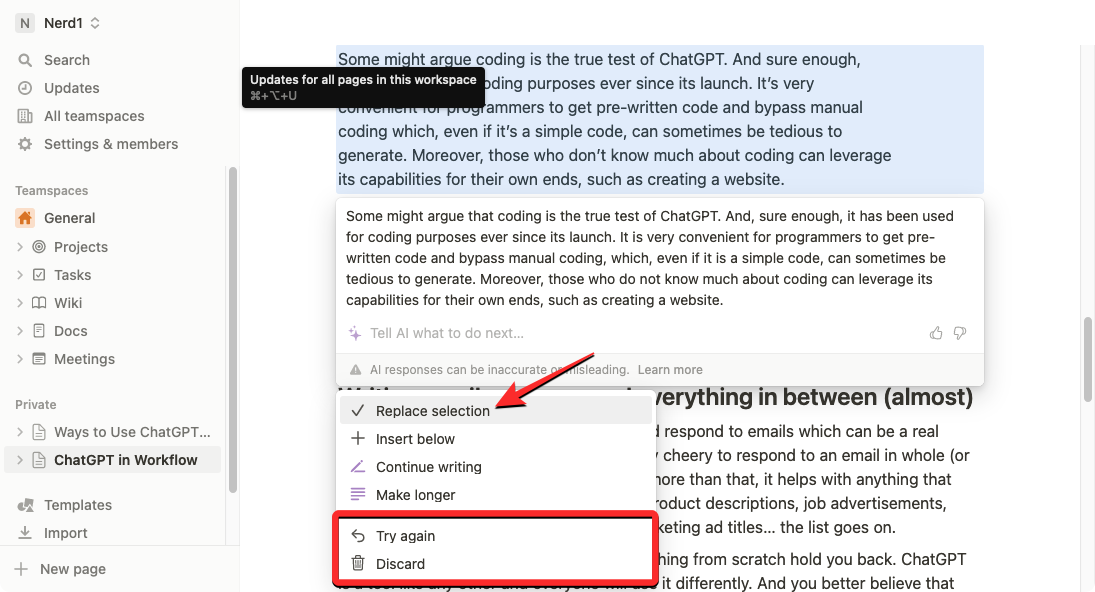 If you’re not okay with the changes, click on Try again to request Notion AI to generate new text or select Discard to prevent the suggested changes from being applied to the page.