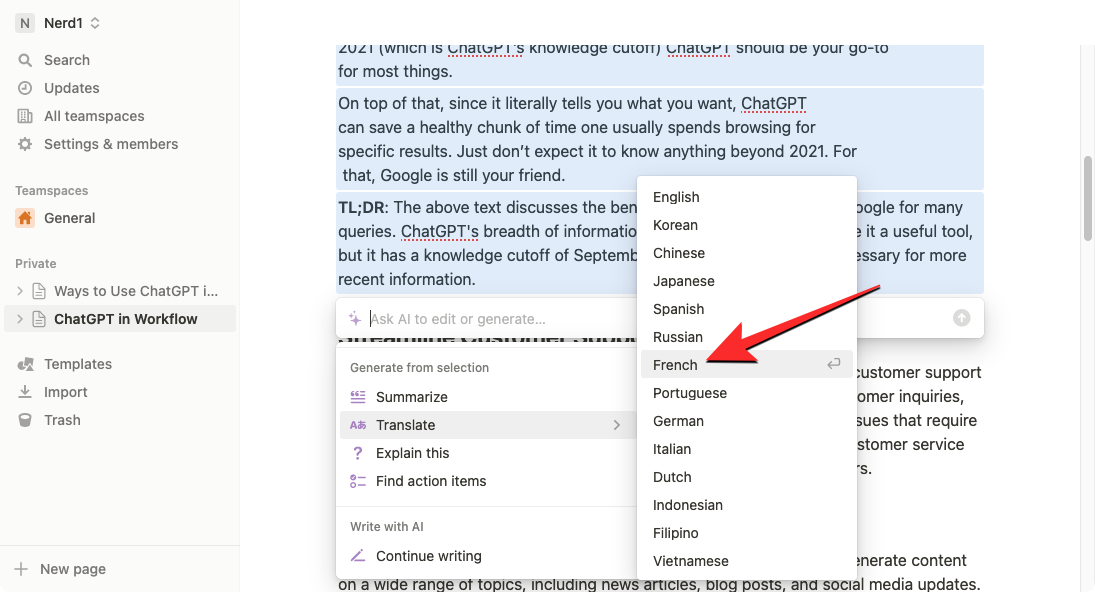 Notion AI can also be used to translate text on the page into another language. At present, you can translate your content across any of the 14 available languages which include English, Korean, Chinese, Japanese, Spanish, Russian, French, Portuguese, German, Italian, Dutch, Indonesian, Filipino, and Vietnamese.