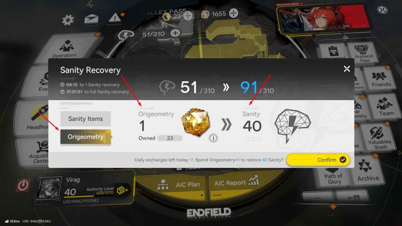 | Restore Sanity | Sanity/Stamina recovery | 1 Origeometry → 40 Sanity | Enables more runs immediately (farming, bosses, progression). |