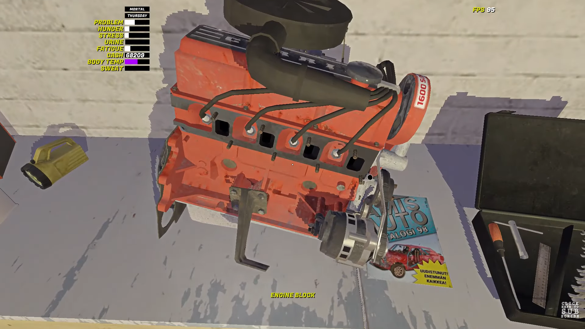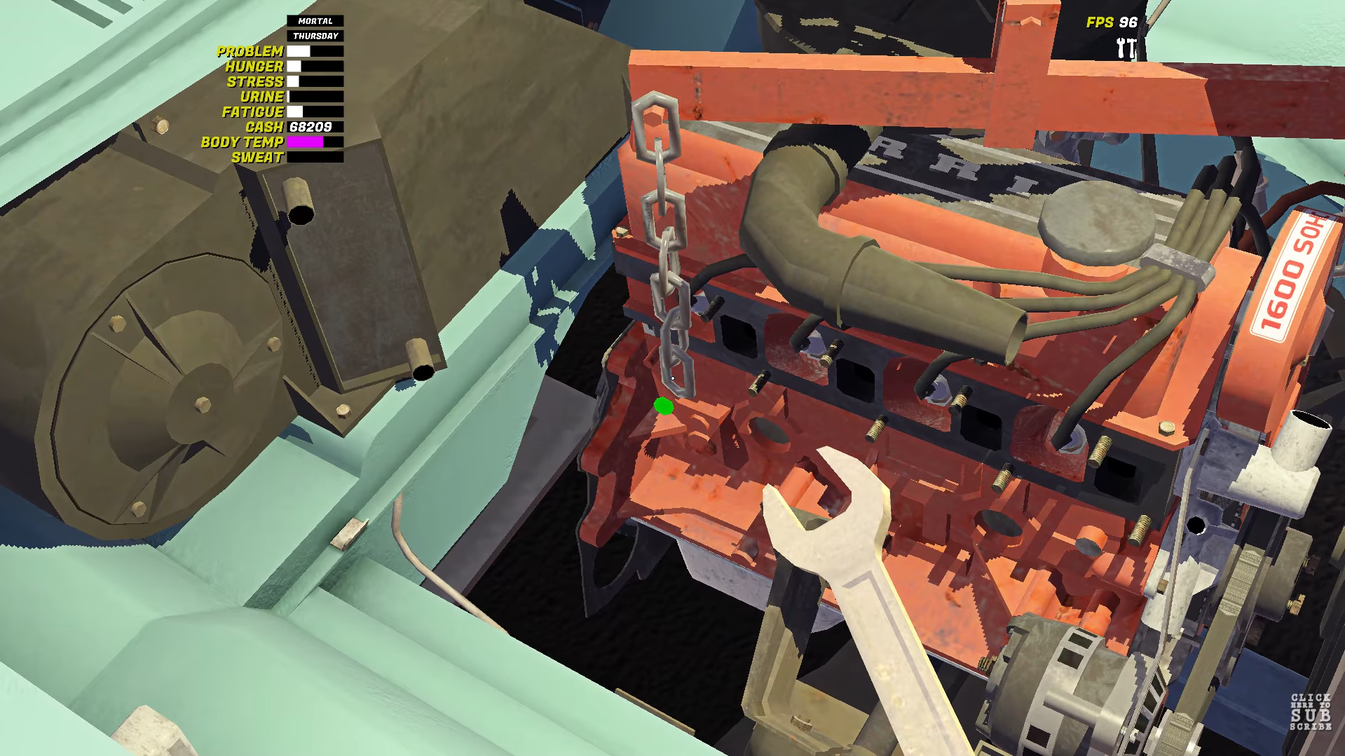 Installing an engine in My Winter Car is simple when the engine is complete. Use a sandbag to adjust its height if needed, let the hoist snap the chains into place, then move and lower the engine into the car, bolt it to the mounts, and remove the chains to complete the installation.